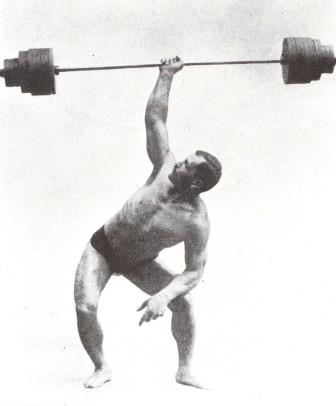 Another of Goerner’s challenges involved snatching a barbell with the arms crossed. If you’ve never tried this just go ahead and do it with an empty barbell and you’ll see how awkward it is. He did this cross-arm snatch with 231.5lbs.