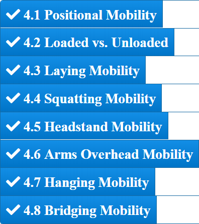 This advanced module introduces the idea of positional mobility. By changing your position, from the neutral standing position, it change how mobile you are and can be. Different positions have different benefits like loading the body in a variety of ways. This material is not covered in other mobility course from what I've seen, yet is crucial for moving onto the next step, as well as expanding your abilities.